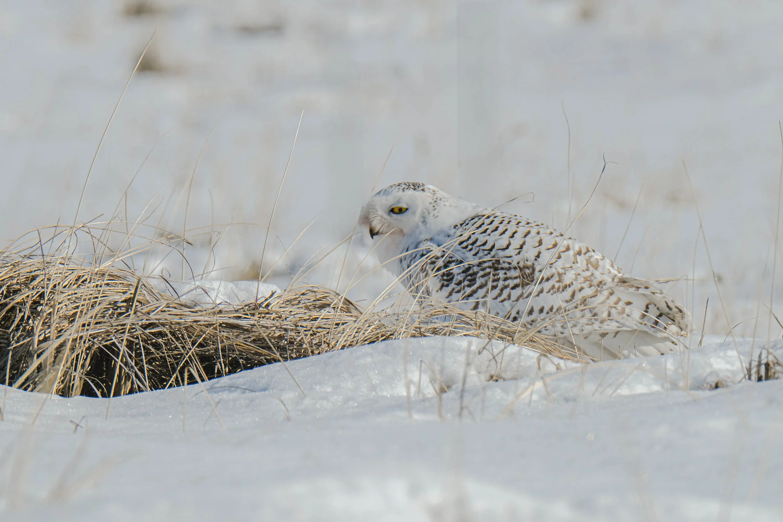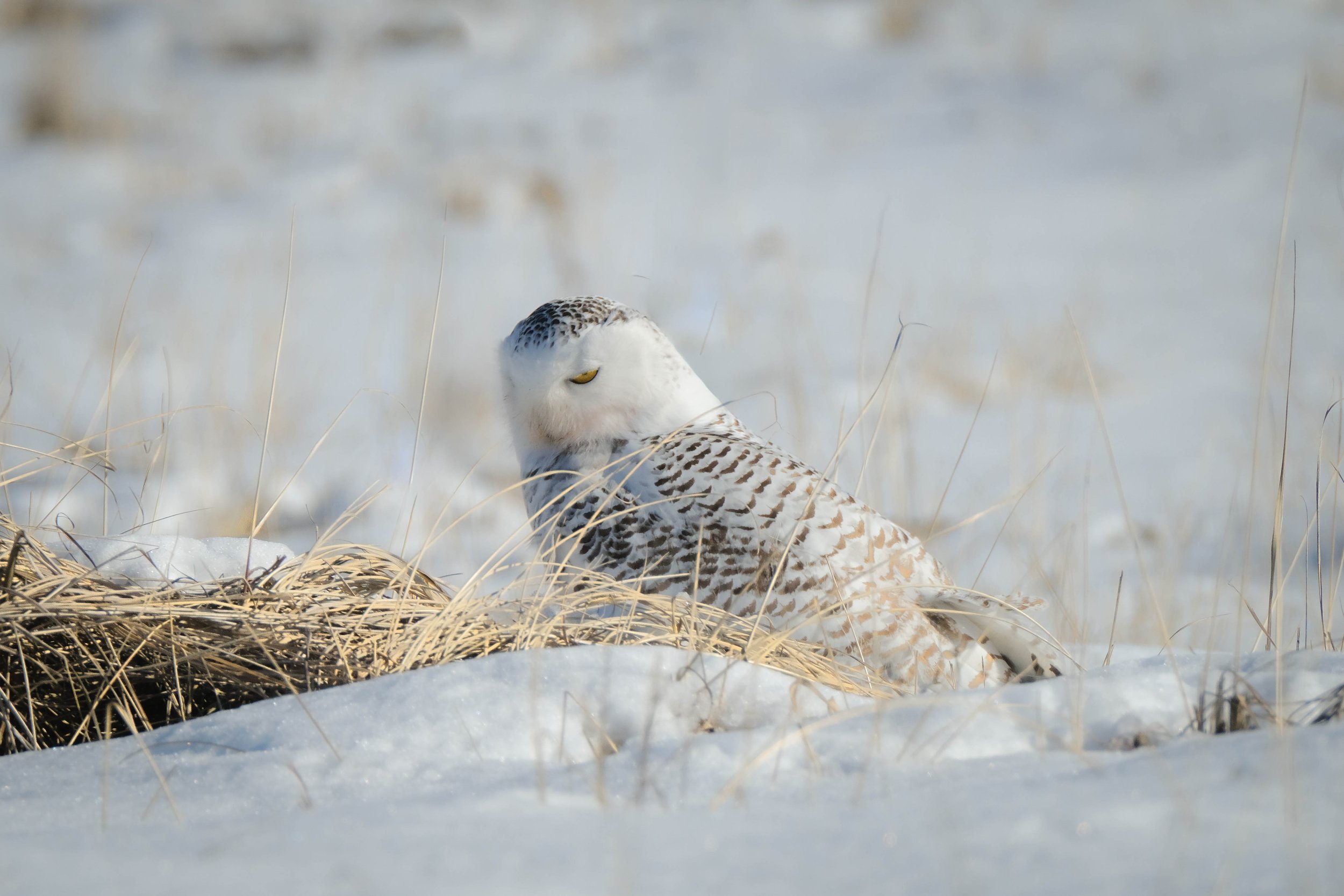 It’s been two years since I’ve seen a snowy owl. I’m not sure if they took a vacation or they just learned how to hide from me and others the past two years. Then again, our weather has been perfect for them this year. They are my favorite of all the raptors and the most beautiful. They are graceful and accommodating when they could be unwelcoming and fly away when we come but no, they stay and they pose and sometimes they even smile. This little one was quite entertaining and only napped for a short time while I was there. She didn’t move around much but she was keeping a close eye on us to make sure we were not invading her territory. I must say that every time I visit my friends in the woods or at the ocean, most of the photographers there have great respect for the welfare of the wildlife. This little one though was foxy and had a surprise for those of us who were so enchanted with her that we stayed awhile. Me, I was hoping that she would fly while I was there. I haven’t gotten a snowy owl in flight yet so that was my hope for this time with her. Shooting wildlife definitely tests and teaches patience. I’m excited to share a few snapshots of my time with her on this very cold winter’s day.