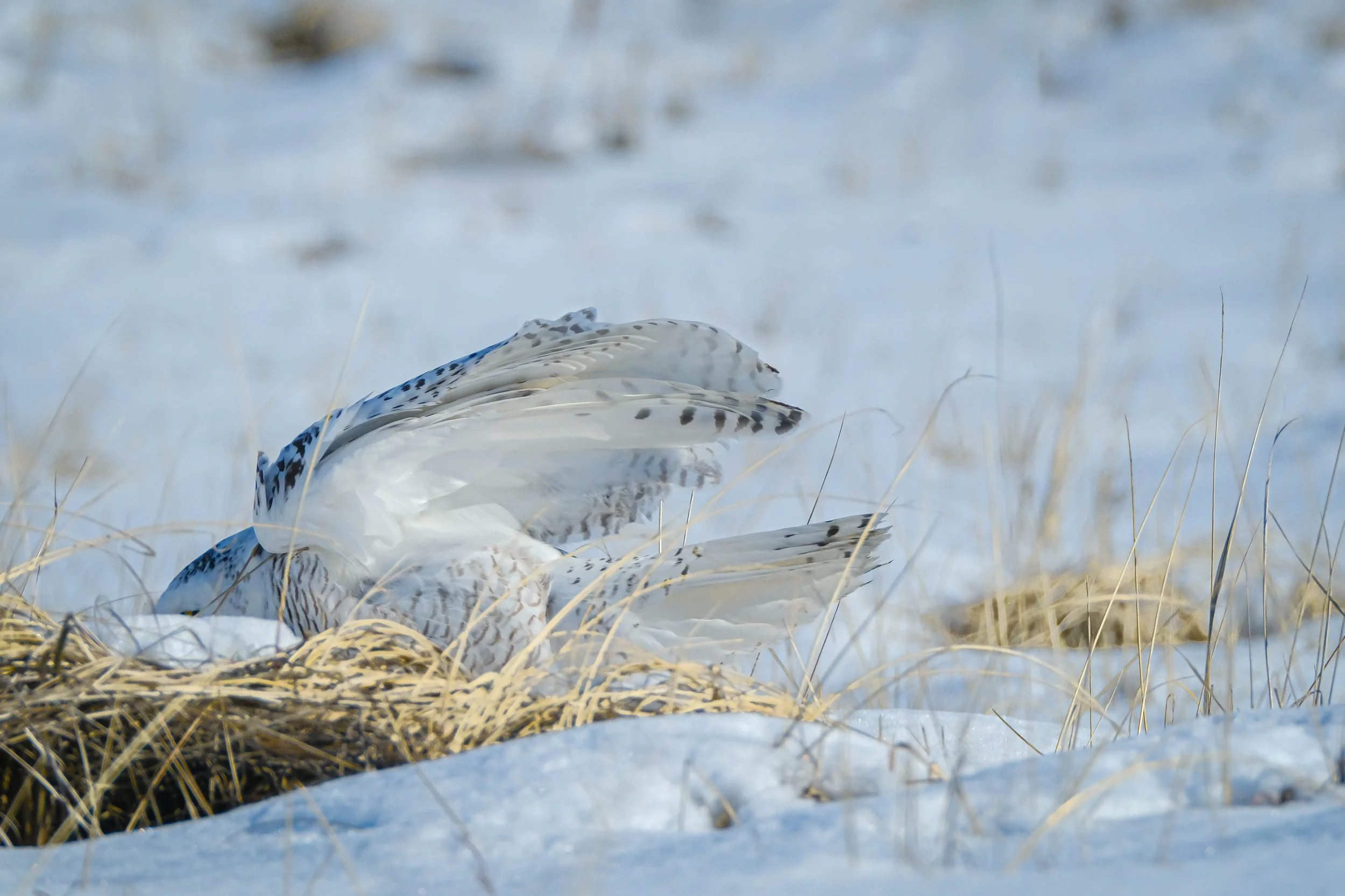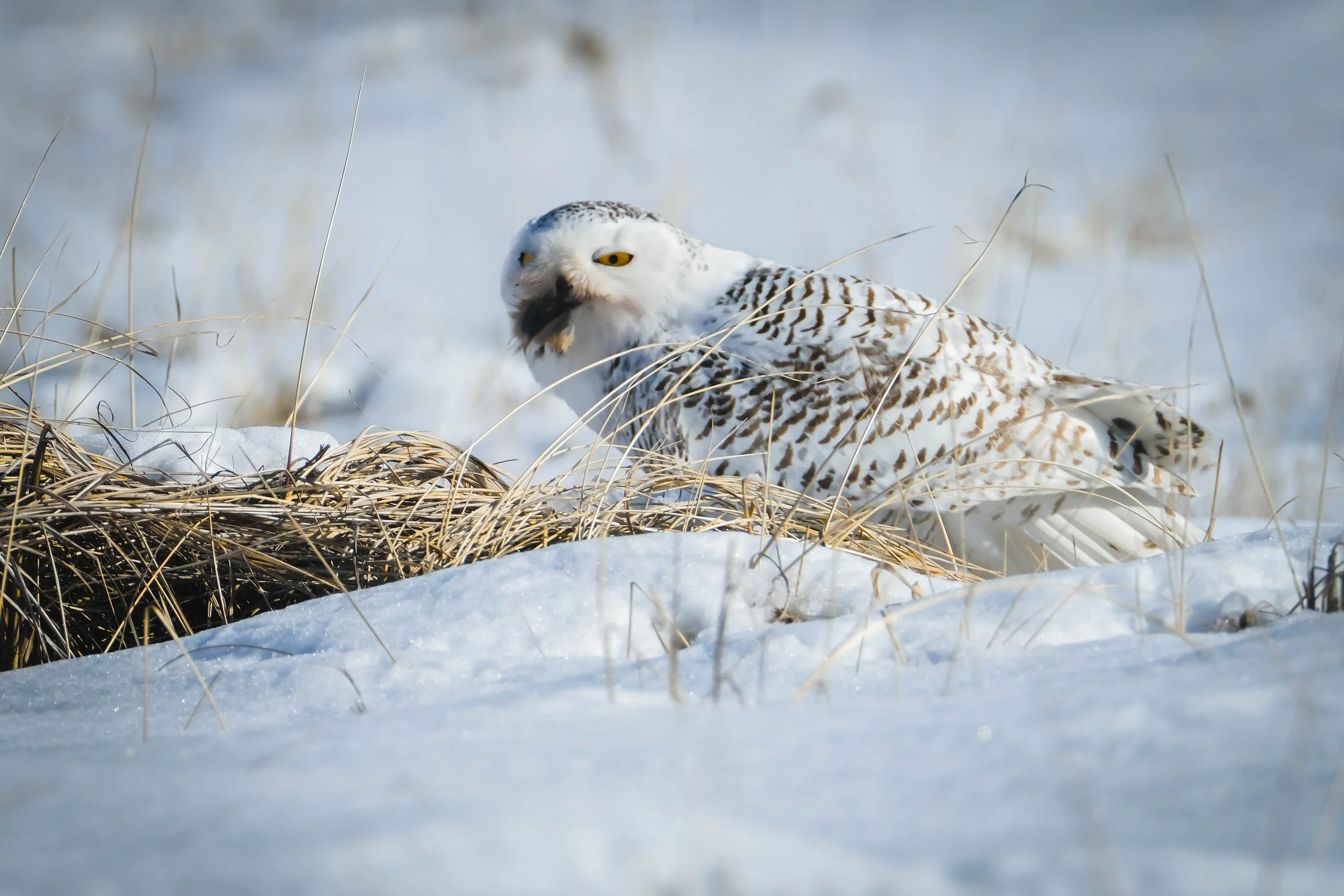 Well, look at this, a bit messy, I would say.. That is a pretty bloody face…the kind of face that if it was one of my grandkids I would grab him by the toes and toss him in the tub…this girl was really enjoying herself. I had to check this out from the side view where the other photographers were standing. I chose my side of the marsh because it was closer to Ramona, that’s the name I gave her, but the group around the corner had an unobstructed view and my side had the marsh grass to work around...I was o.k. with that because I love the marsh grass. It adds to the scene and also adds a bit of that beach texture. Once I turned the corner though and saw where Ramona was getting her lunch, I almost wished I had stayed on my own side. There was this little beautiful rabbit sitting in snow. I know it was beautiful, because Ramona didn’t destroy her head…it was just sitting on the snow, eyes opened like she was alive…and the owl was pulling off her back end. I was so upset by the site of the poor bunny that I didn’t even take a shot of it. I just turned around and said a little prayer for the bunny and went back to take my place on the other side of the marsh.